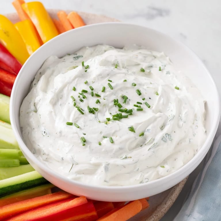 Save A creamy, tangy dip made with cream cheese and ranch seasoning, served alongside crisp, colorful veggie sticks—perfect for snacking or parties.