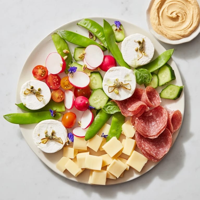 Save A vibrant, elegant appetizer tray inspired by nature's colors and textures, perfect for entertaining. Features a delightful medley of fresh vegetables, cheeses, cured meats, dips, and crackers arranged artfully to evoke the grace of dragonflies.