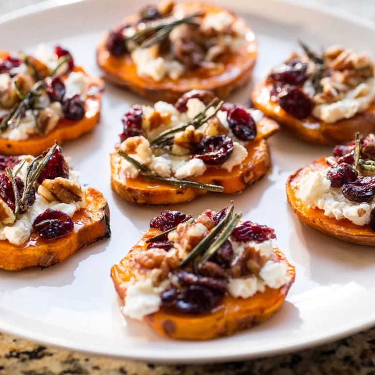 Save Tender roasted sweet potato slices topped with creamy cheese, cranberries, and pecans—a festive, flavorful appetizer perfect for holiday gatherings.
