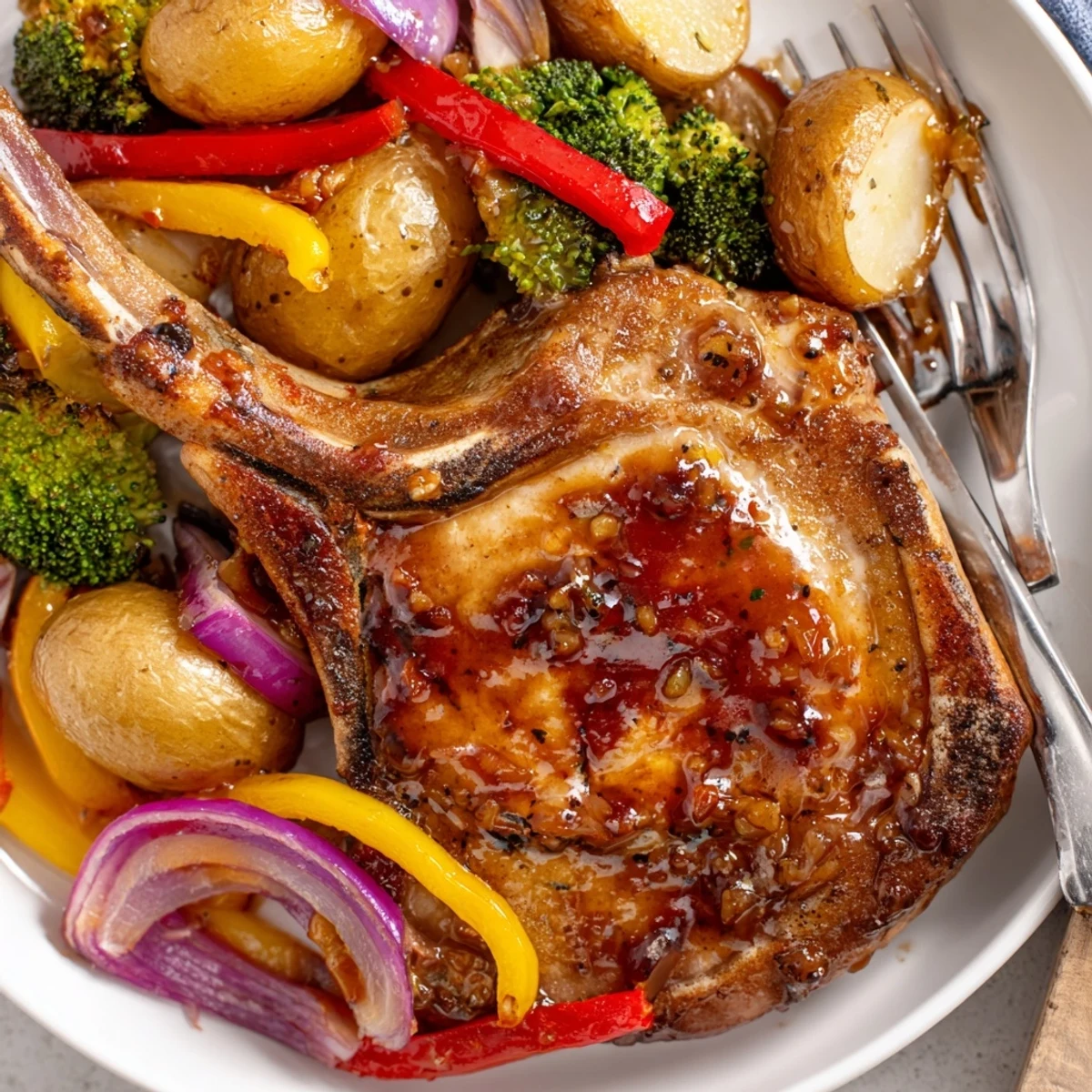Save Tender pork chops glazed in a sweet and savory honey garlic sauce, roasted alongside colorful vegetables for a complete, easy, and delicious meal—all on one pan.
