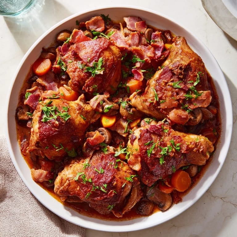Save A modern, one-pot take on the classic French dish, featuring tender chicken thighs simmered in red wine with mushrooms, bacon, and aromatic vegetables ready in a fraction of the traditional time.