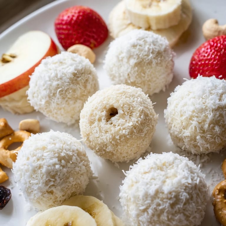 Save A festive and fun dessert dip this platter features a creamy marshmallow dip rolled in coconut snowballs perfect for kids parties and holiday gatherings.