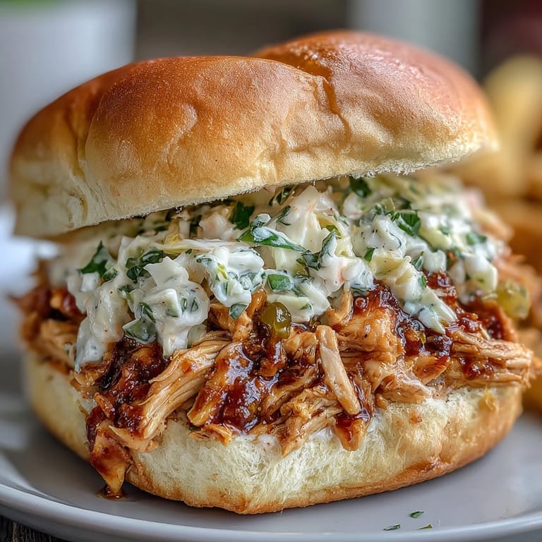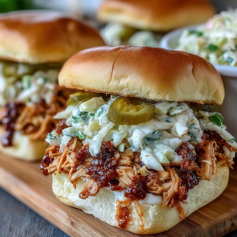 - Pile a generous amount of shredded chicken onto each slider bun bottom, top with a small handful of coleslaw (don't be shy here—it's the star player), add pickles if you want extra tang, and crown with the bun top. These are best served immediately while the chicken is still warm and the coleslaw is still crisp.