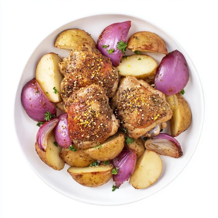 Save Experience the vibrant aroma and comforting flavors of Middle Eastern cuisine with this Pan-Roasted Zaatar Chicken and Potatoes. Crispy chicken thighs and golden, tender potatoes are tossed in fragrant zaatar and roasted to perfection, delivering a simple yet impressive weeknight meal. With its blend of spices, fresh lemon zest, and easy preparation, this dish brings warmth and bold taste to your dinner table.