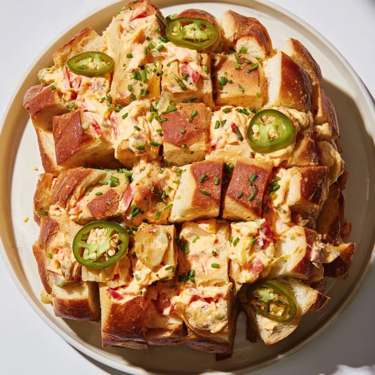 Save A fun, shareable twist on classic grilled cheese featuring creamy pimento cheese and spicy jalapeños baked into pull-apart bread—perfect for gatherings or game day.