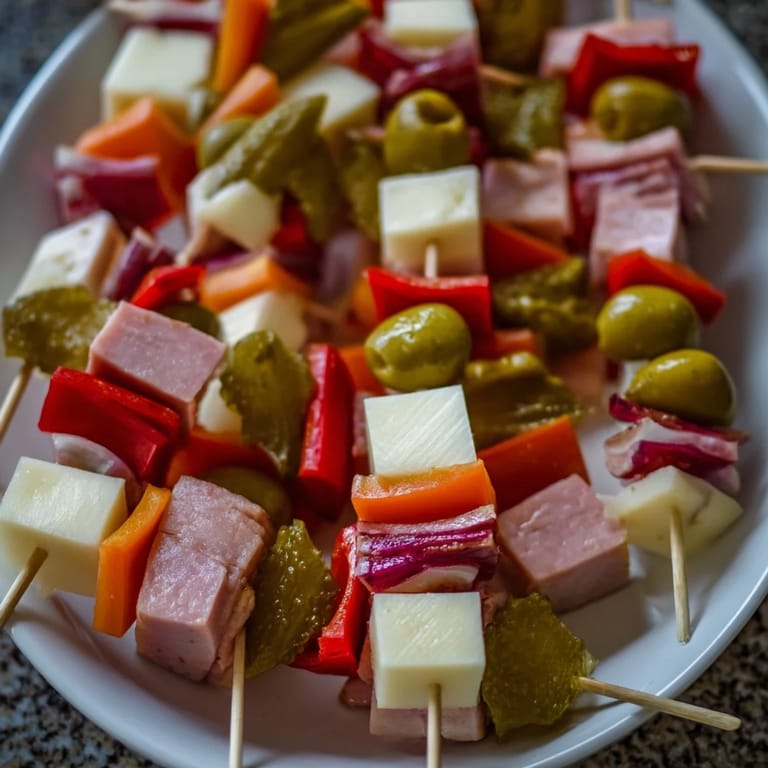 - Prepare all ingredients by cutting the meats, cheeses, and pickles into even-sized cubes or chunks.