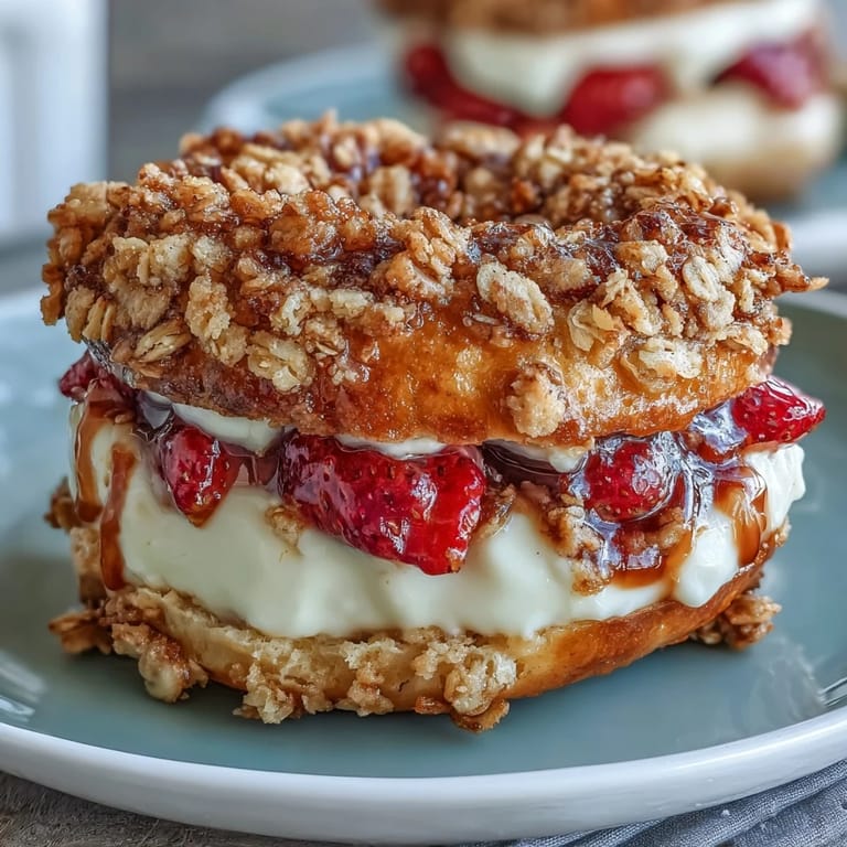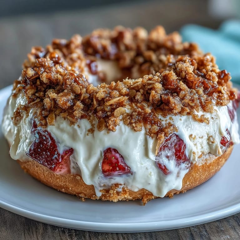 Save I stumbled onto these bagels on a Tuesday morning when I was tired of my usual protein shake routine and staring at a container of Greek yogurt that needed using. The idea hit me suddenly: what if I could make something that tasted like dessert but actually fueled my day? That first batch came out wonky—one bagel looked more like a lumpy potato—but the moment I bit into one with that creamy cheesecake center and strawberry sweetness, I knew I'd found something special.